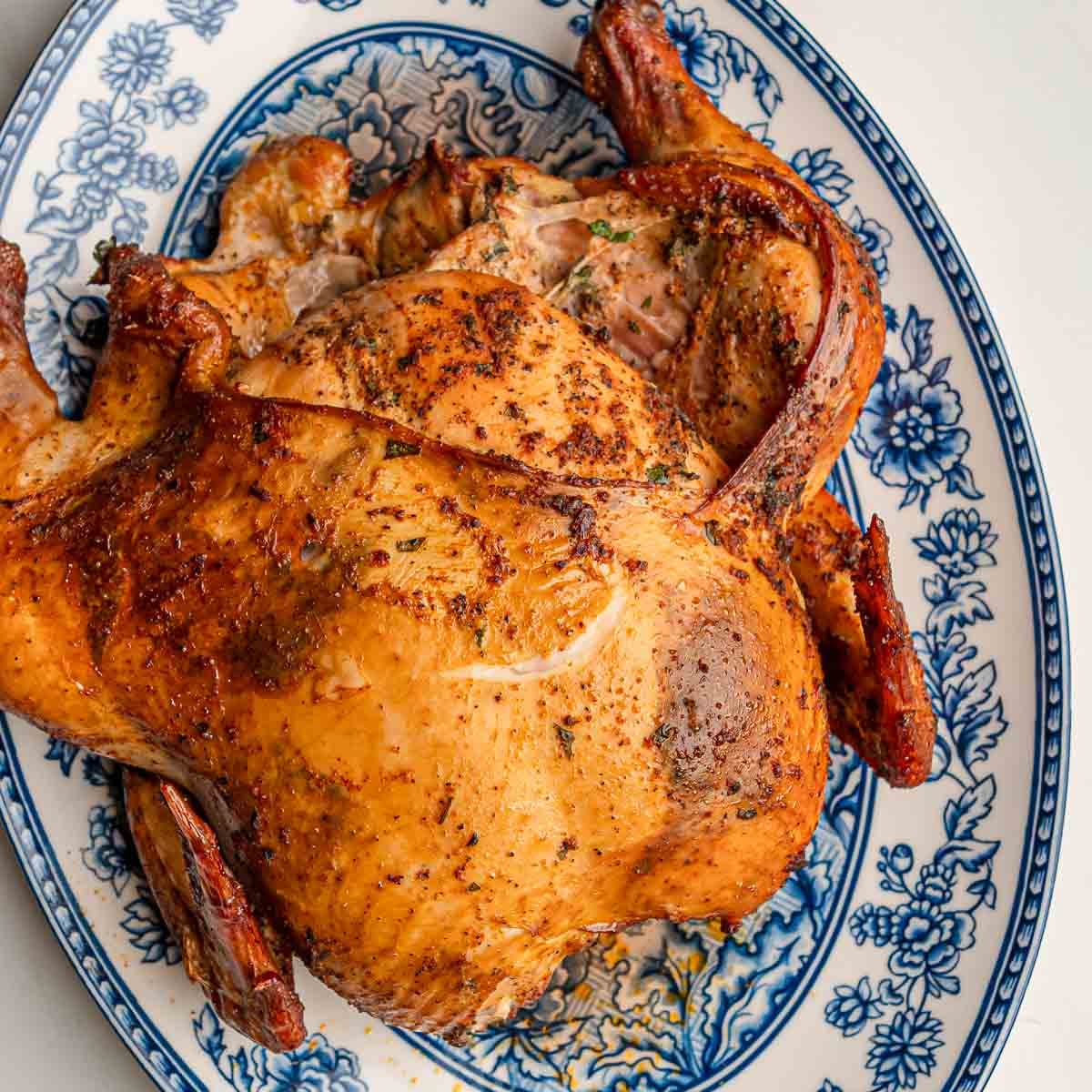 • Lemon herb smoked whole chicken fresh out of the electric smoker.